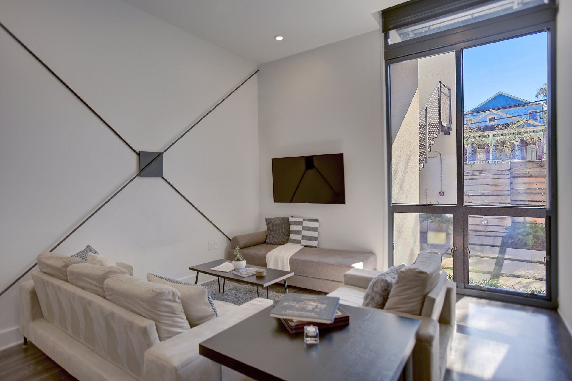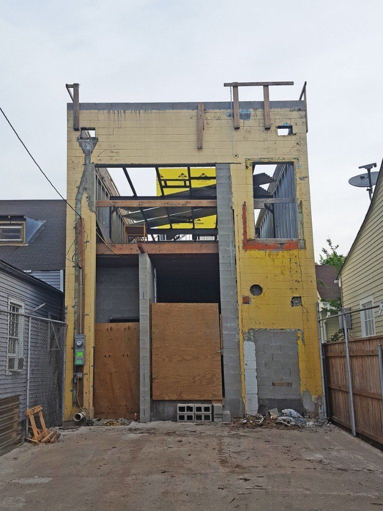 With several variances from the City and State, and through an FHA loan we gutted the 1971 warehouse that was once used to make Mardi Gras floats. Considerable time was invested in relatively unique design and construction techniques. To raise the 1st floor above flood elevation we added another slab on top of Styrofoam. The building was zero-lot-line and had very little space to store materials. We leased land from our neighbors to do work on the building and staged the construction to facilitate crane access for adding the 3rdfloor.